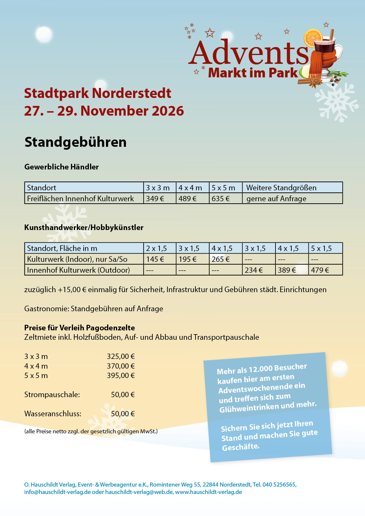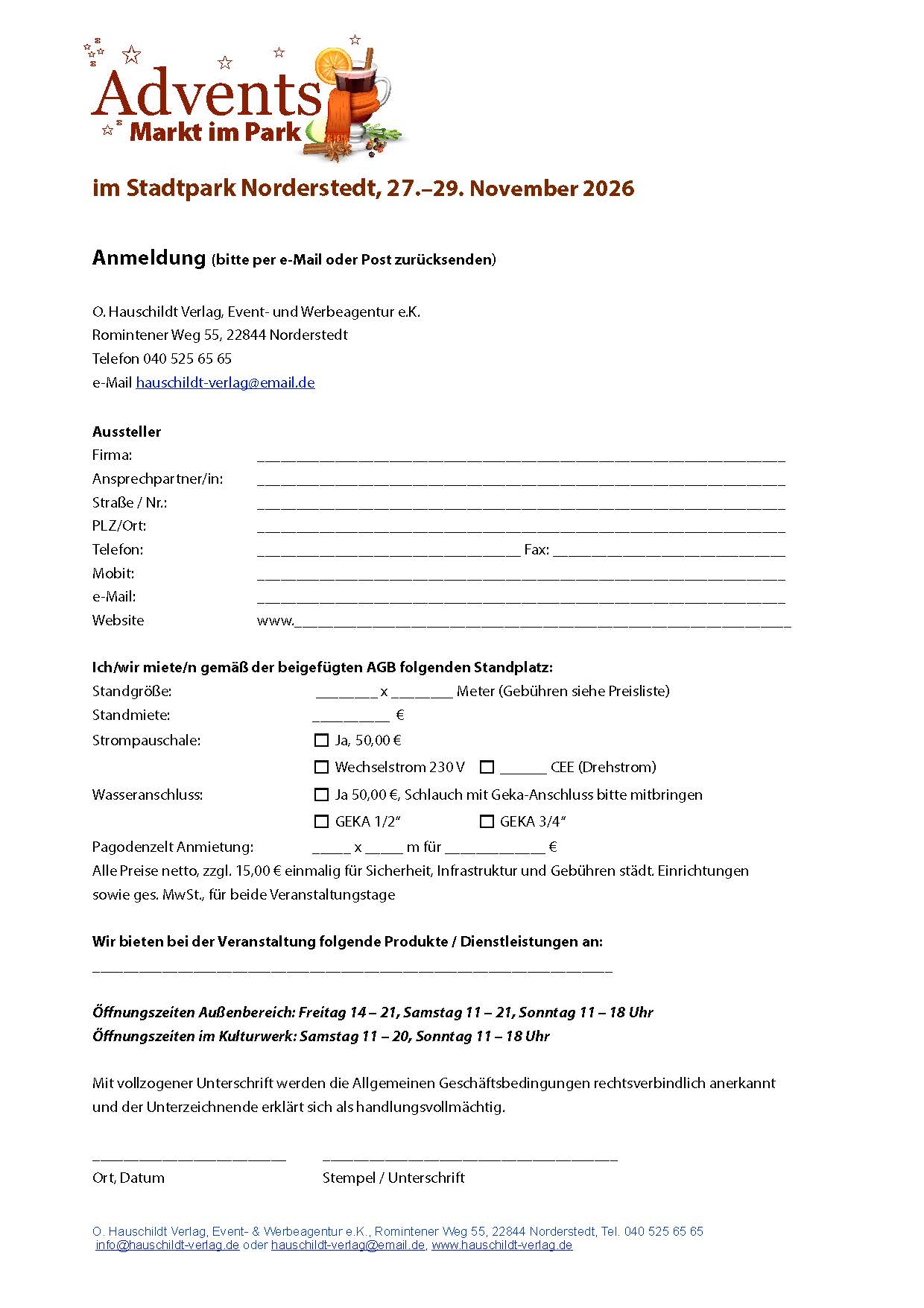 Treffen Sie neue Kunden im wunderschönen Ambiente im Norderstedter Stadtpark. Am ersten Advents-Wochenende, vom 27. bis 29. November 2026, findet der Advents-Markt ab Freitag wieder statt. Der Markt wird veranstaltet vom bewährten Team der trends-Messe, www.trends-norderstedt.de, die mit vielen Tausend Besuchern ein großes und sehr erfolgreiches Event ist.